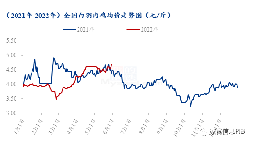 5月白羽肉鸡价格整体呈现高位震荡态势,并在月末的一波持续上行后,刷新白羽肉鸡价格的年内高点。月内白羽肉鸡全国棚前均价4.54元/斤,较上月上涨0.08元/斤,环比涨幅1.79%,同比涨幅1.34%。整体5月仍处年后新冠疫情造成的鸡源不足阶段;当前毛鸡因季节养殖难度存在提前出栏现象,提前消耗了下半月毛鸡的理论增量;山东主产区调整工资结构,被迫提高宰量,进一步加剧毛鸡供应的相对不足;供给面的强力支撑下,毛鸡价格高位震荡后于月底刷新年内高点。东北地区受鸡源短缺支撑,5月呈高位攀升态势。