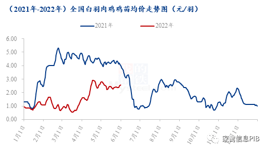 据统计,5月白羽肉鸡鸡苗均价2.46元/羽,环比涨幅13.36%,同比跌幅41.43%。本月鸡苗价格涨跌互现。毛鸡价格高位震荡,连续突破今年高位,养殖盈利较好,养殖户补栏积极性较高,种禽企业排苗计划顺畅,个别企业6月份计划已排完,市场走苗较快,叠加东北地区前期受新冠疫情影响,种蛋上孵量不大,导致现阶段市场鸡源紧缺,毛鸡价格独领风骚,鸡苗价格随之上涨;但是饲料价格仍然处于高位,终端产品消费受限,鸡苗价格过高,养殖端会有抵触情绪,市场走苗渐缓,鸡苗价格高报低走,但是鸡苗价格处于区间震荡走势。
