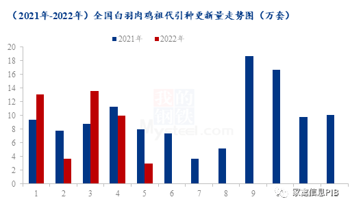 据统计,2022年5月,全国白羽肉鸡祖代引种更新量约为3万套左右,环比跌幅70%,同比跌幅62.17%。本月因美国到中国的航班问题尚未解决,部分祖代场引种计划被迫暂停,祖代更新量主要以国内自繁为主。本月整体引种更新量减量较为显著,建议着重关注航班恢复和国外禽流感的情况。