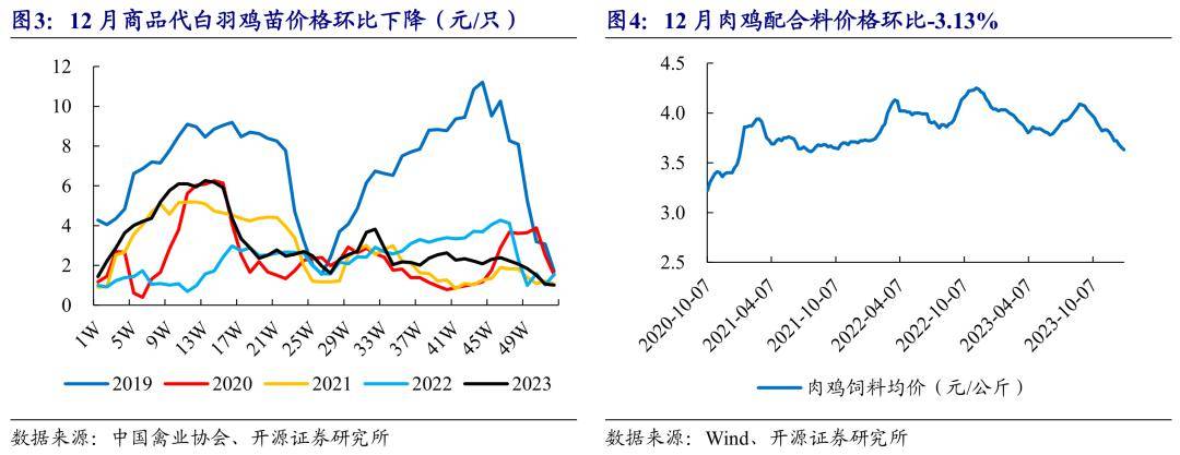 12月鸡苗及饲料价格下行,后续肉鸡饲养本钱有望进一步下降。12月产品代白羽鸡苗均价降至1.36元/只,月环比-0.89元/只。饲料方面,饲料价格继续回落,12月肉鸡饲料价格环比-3.13%。产品代鸡苗供应足够,饲养亏本布景下产品代鸡苗补栏活跃性弱,鸡苗价格趋势向下,叠加饲料价格继续下行,估计后市肉鸡饲养本钱将有显着改进。