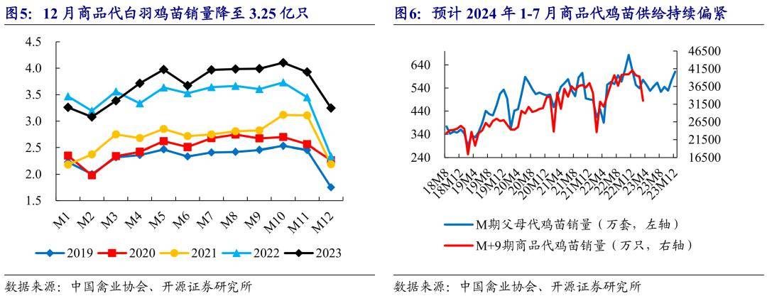12月产品代鸡苗销量下降,供应缩短或继续至2024年7月。12月产品代白羽鸡苗销量3.25亿只,环比-0.68亿只。12月处补栏年鸡最终节点,但饲养亏本导致养户补栏活跃性差,下游走货不畅,12月下旬多家禽企进入停苗期,鸡苗供应缩短。展望后市,受2023年4-10月爸爸妈妈代鸡苗供应低位运转影响,估计2024年1-7月产品代鸡苗供应继续偏紧。
