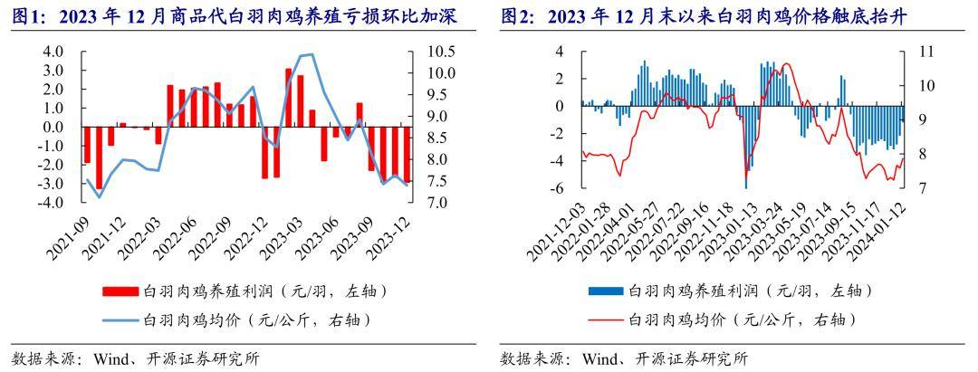 白羽肉鸡价格拐点已现,2024Q1有望供需双驱景气抬升。据博亚和讯,2023年12月全国白羽肉鸡出售均价7.40元/公斤,环比-0.23元/公斤,饲养赢利-2.93元/羽,环比-0.28元/羽。受12月中旬以来禽企停苗及养户补栏跨年鸡影响,白羽肉鸡苗供应偏紧带动肉鸡价格触底抬升,到2024年1月12日,白羽肉鸡价格已升至7.87元/公斤,饲养亏本继续收窄。周期传导看,2024Q1白羽鸡需求旺季叠加前期祖代引种缺口传导至肉鸡端,白鸡价格有望景气向上。