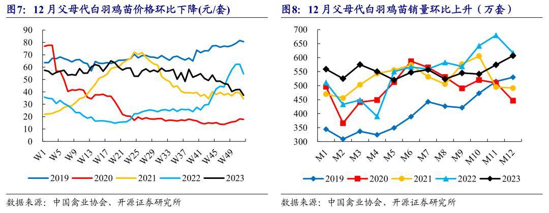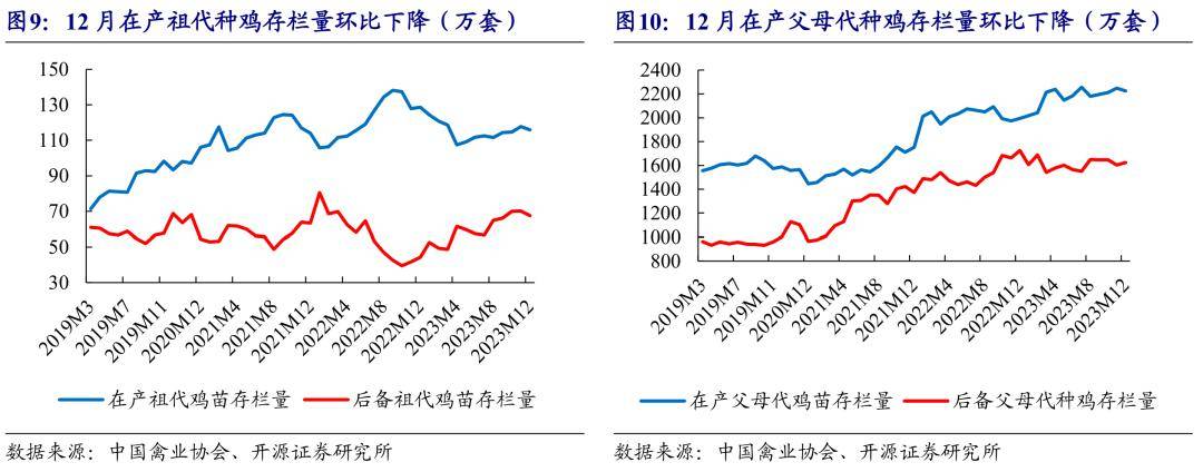 爸爸妈妈代鸡苗销量增势或难连续,祖代种鸡总存栏已敞开去化。12月爸爸妈妈代白羽鸡苗均价40.33元/套,环比-7.22元/套,白羽鸡苗销量607万套,环比+6%。祖代及爸爸妈妈代种鸡存栏看,12月末职业白羽祖代种鸡总存栏量183.52万套,环比-2.3%,其间在产环比-1.5%,后备环比-3.6%。爸爸妈妈代种鸡总存栏3850.03万套,环比-0.1%,其间在产环比-1.0%,后备环比+1.2%。受在产及后备祖代种鸡存栏环比下行及爸爸妈妈代鸡苗价格走低影响,爸爸妈妈代鸡苗销量增势或难以保持,估计2024Q1爸爸妈妈代鸡苗供应逐渐缩短。
