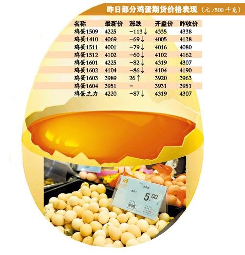 但是,另一边厢,昨日鸡蛋期货收盘价纷纷下跌,鸡蛋1509昨日一度跌停,截至收盘鸡蛋1509跌幅2.6%。