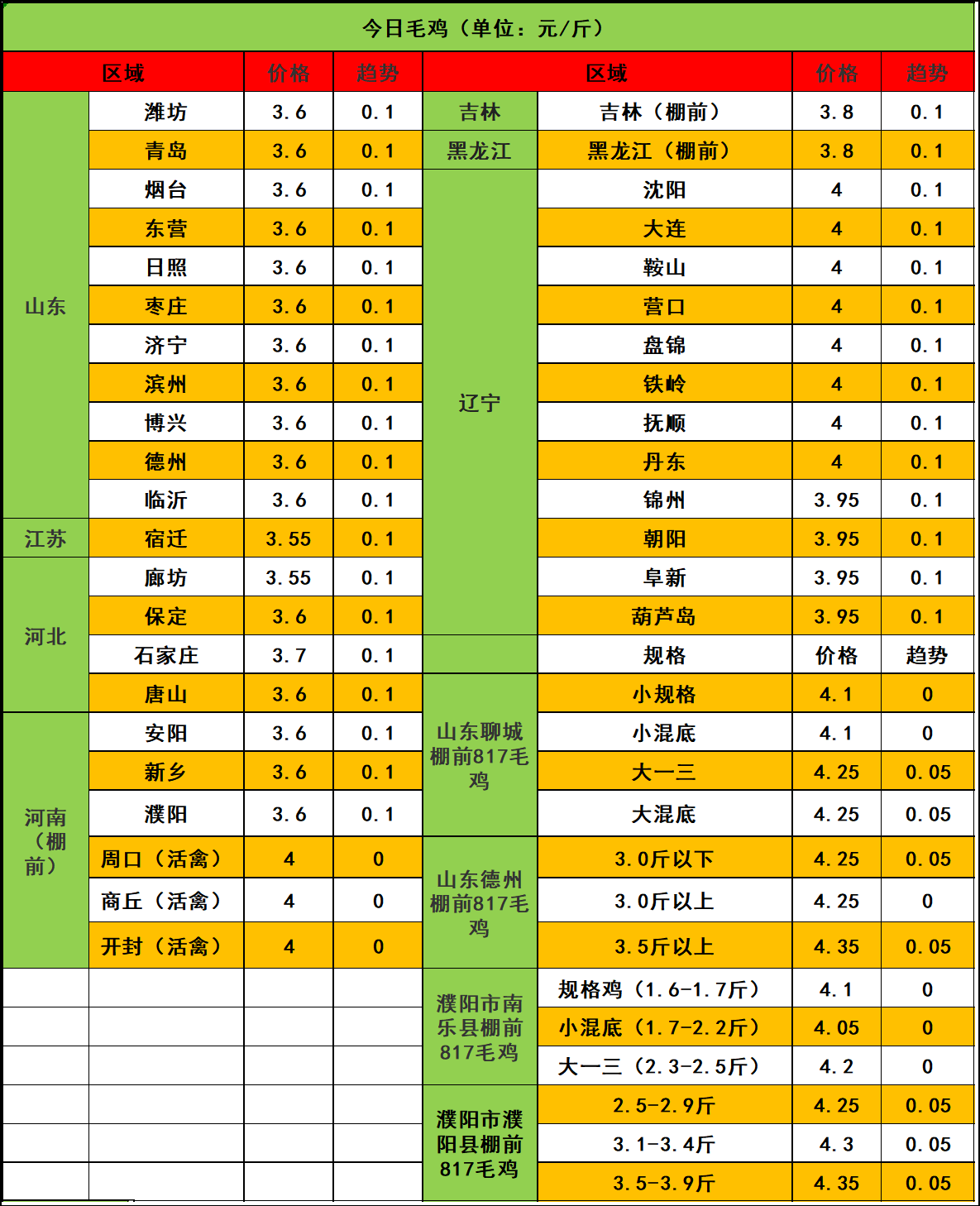 注:鸡苗报价紊乱,厂家高报低开,大小厂鸡苗价格差异巨大,实践价格按照产品行情、消费、鸡苗出孵现状剖析,估计近期鸡苗价格呈震动调整趋势;种蛋报价涨1毛。