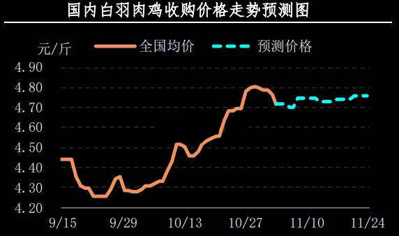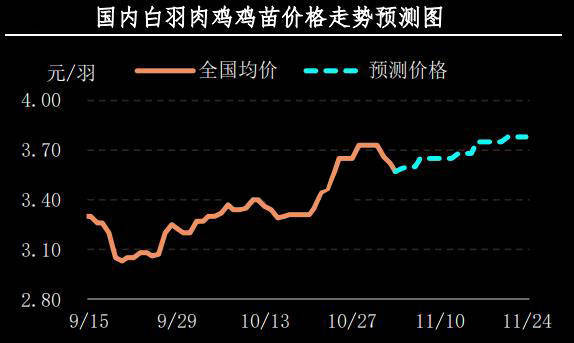 白羽肉鸡鸡苗:短期内商场苗量或动摇不大,鸡苗价格下滑后饲养户补栏活跃性略有提高,孵化场排苗速度加速,苗价或窄幅上行。下半月孵化场出苗量或略增,饲养户多方案补栏年前最终一批毛鸡,商场需求较好,需求面提振效果较强,孵化场排苗较为顺利,鸡苗价格或震动上涨。估计未来三周白羽肉鸡鸡苗价格递上行走势。