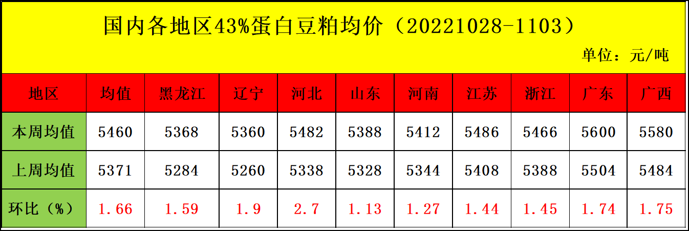 本周国内豆粕现货均价5460元/吨,与上星期均价比较,上涨89元/吨,涨幅1.66%。