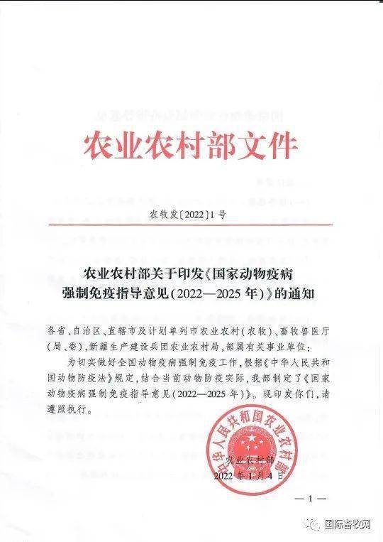 2022年1月,农业农村部制定《国家动物疫病强制免疫指导意见(2022—2025年)》。该文件提出了“高致病性禽流感等合格率常年保持在70%以上”的目标要求,对“对全国所有鸡、鸭、鹅、鹌鹑等人工饲养的禽类,根据当地实际情况,在科学评估的基础上选择适宜疫苗,进行H5亚型和(或)H7亚型高致病性禽流感免疫”。此外,制定免疫计划,对散养动物,采取春秋两季集中免疫与定期补免相结合的方式来进行,对规模养殖场(户)及有条件的地方实施程序化免疫。