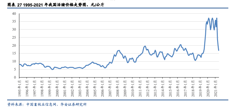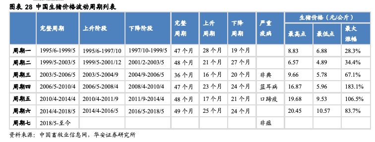1995年1月-2021年6月,我国生猪价格经历了6轮完整周期,最短36个月,最长49个月,猪价波动周期3-4年,其中,最大一波上涨出现在06年5月-08年4月,涨幅高达183.1%,这是由蓝耳病爆发和玉米价格攀升共同作用的结果。第七轮周期从2018年5月至今,2018年8月我国发生第一例非瘟疫情,之后全国生猪产能大幅下降。截至目前,本轮周期生猪月度最高价37.15元/公斤,于2020年8月达到,最大涨幅251.5%。