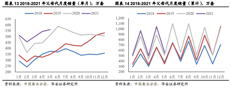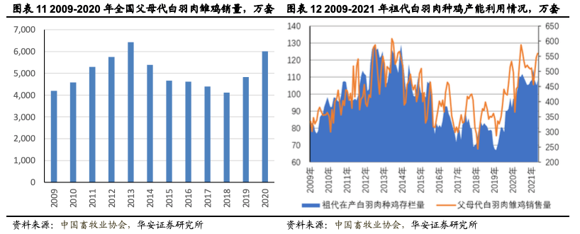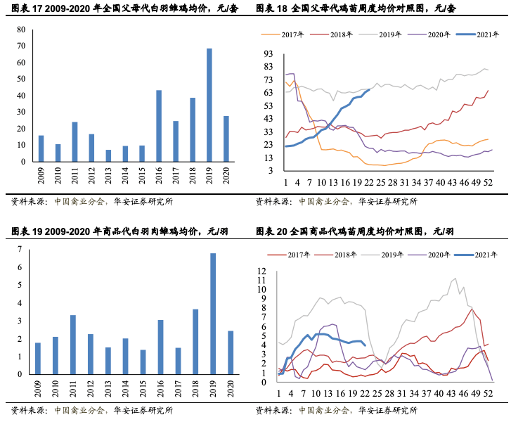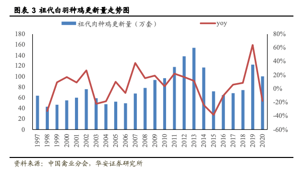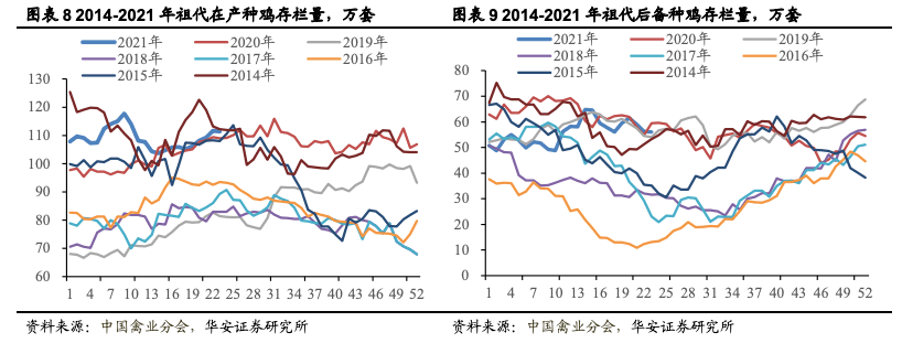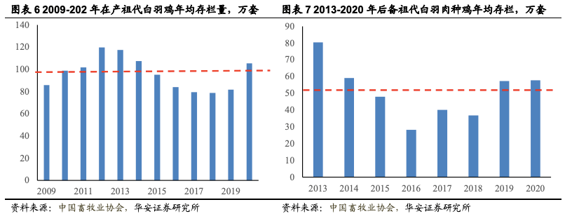 4、2019年9月以来,在产祖代存栏快速走高,2020年达到105.48万套,行业再次进入下行周期。