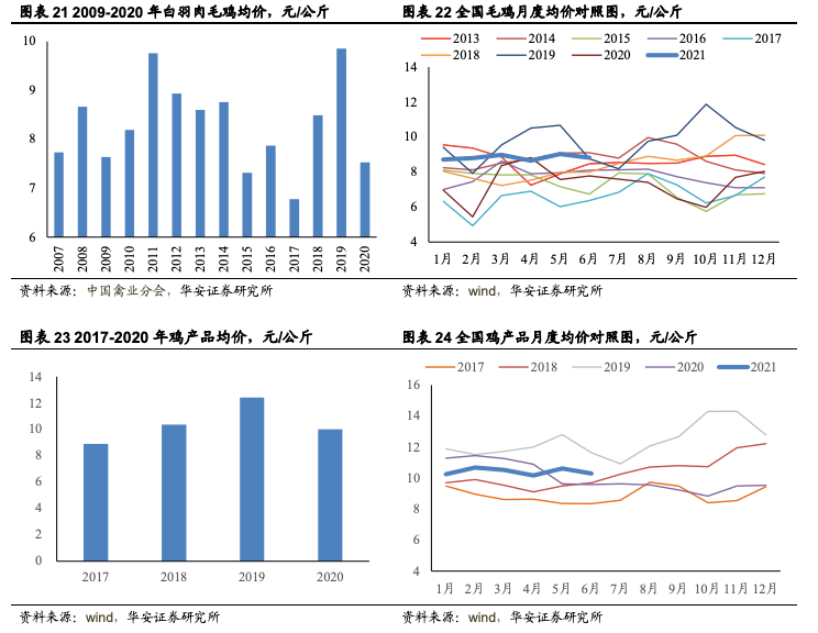从替代品角度看,猪价短期暴跌基本结束,7月中旬之后猪价有望企稳回升。中期看,我们初步判断,本轮猪价下行周期或短于以往周期,需持续关注能繁母猪存栏量变化;2021-2022年猪价难以对鸡价上涨形成很强的推力。
