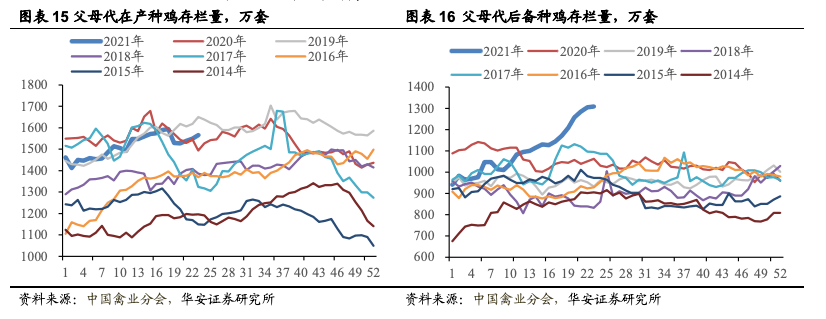 根据禽业协会数据,2021年第23周,我国在产祖代种鸡存栏量111.3万套,同比增长2.2%,我国后备祖代种鸡存栏量56.07万套,同比下降5.8%,均处于2014年以来高位。