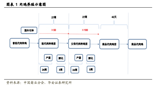 白羽肉鸡生产也呈现扩繁系数高的特点。1套祖代肉种鸡可提供50套父母代肉种鸡,1套父母代肉种鸡可提供100-130只商品代鸡苗,从祖代到商品代扩繁系数可高达5000-6500倍。