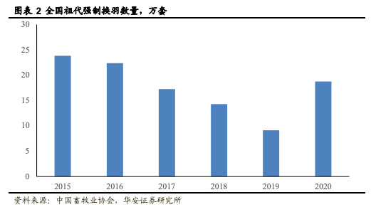 强制换羽在业内非常关注,祖代、父母代健康种鸡均可实施强制换羽,突破原有产能瓶颈,带来全行业产能增加。强制换羽也会对产业产生负面影响,大多数表现在种鸡生产性能直线下降,以及疾病风险增加。2015年之后,我国白羽肉鸡行业受封关影响强制换羽数量较多;2019年,随着新西兰供种能力增加以及圣泽901投入到正常的使用中,祖代强制换羽数量一下子就下降;2020年,新冠疫情爆发阻碍了祖代企业正常引种,祖代强制换羽再次大增。