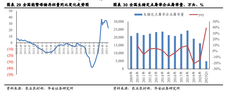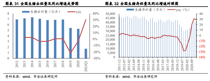 2019-2020年,我国生猪定点屠宰企业屠宰量分别为19,116万头、16,259万头,同比分别下降21.2%、14.9%;我国生猪出栏量分别为5.44亿头、5.27亿头,同比分别下降21.6%、3.2%。2021Q1我国生猪定点屠宰企业屠宰量4884万头,同比增长30.0%,我国生猪出栏量1.7143亿头,同比增长30.6%。从2021Q1数据看,我国生猪养殖产能及出栏量已明显恢复。