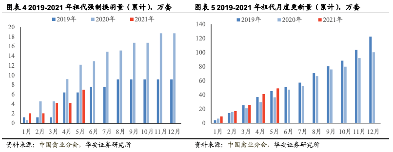2021年1-5月我国祖代更新量49.12万套,同比增长34.4%,祖代强制换羽6.97万套,同比下降43%;我国祖代更新和强制换羽共计56.09万套,同比增长15%。从今年前5月祖代更新情况看,2021年祖代更新量将同比增长,然而,考虑到美国、新西兰复关存在变数,全年引种量需持续跟踪。