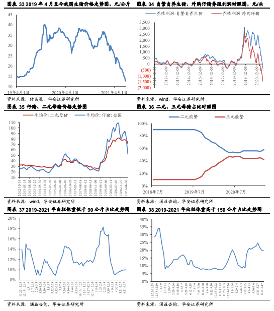 中期看,生猪养殖环境骤变,养殖户需要承受资金链紧张的问题,还需继续应对非瘟野毒和疫苗毒问题,复杂程度远超以往任何一轮周期。此外,2021年3月全国三元母猪占能繁母猪比重约42%,由于三元母猪效率低,且仔猪落地成本较二元高350-400元/头,在猪价低迷的情况下,养殖户会倾向于淘汰三元母猪。我们初步判断,本轮猪价下行周期或短于以往周期,我们将重视能繁母猪存栏量变化。