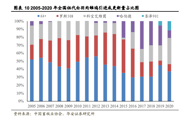 我国白羽肉鸡祖代雏鸡主要从国外进口。美国禽流感爆发之前,我国97%左右的白羽肉鸡种源来自美国,2015年美国禽流感爆发,法国曾代替美国成为中国供应种源主要来源地。2016年,在美、法相继爆发禽流感被迫封关的情况下,我国开始从西班牙、新西兰、波兰引进白羽肉鸡种源;2017年,西班牙、波兰先后因禽流感封关,年内新西兰成为主要引种来源,2017年新西兰供应中国的祖代雏鸡大多数来源于2014年美国禽流感以后安伟捷公司对全球产能的调剂,2018年以来,我国祖代引种基本来自新西兰。2019年我国开始供应少量祖代雏鸡,2020年我国自繁祖代雏鸡数量增加,我国也放开来自美国的祖代雏鸡进口,引进品种主要为AA+、科宝艾维因、哈伯德以及罗斯308。曾祖代方面,益生股份分别于2016年11月、2018年1月引进哈伯德曾祖代1.7万只、3万只,2019年科宝开始在国内饲养曾祖代供应祖代雏鸡。