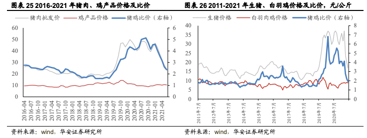 2011-2021年,生猪和白羽肉鸡比价在1.27-6.82之间波动,均值为2.28,2020年高点6.82是受非瘟疫情致猪价暴涨。2021年6月猪鸡比价比价已降至1.9,低于均值水平。2016-2021年,猪肉和鸡产品比价在1.59-5.13之间波动,均值为2.78,2021年6月比价已降至2.36,低于均值水平。