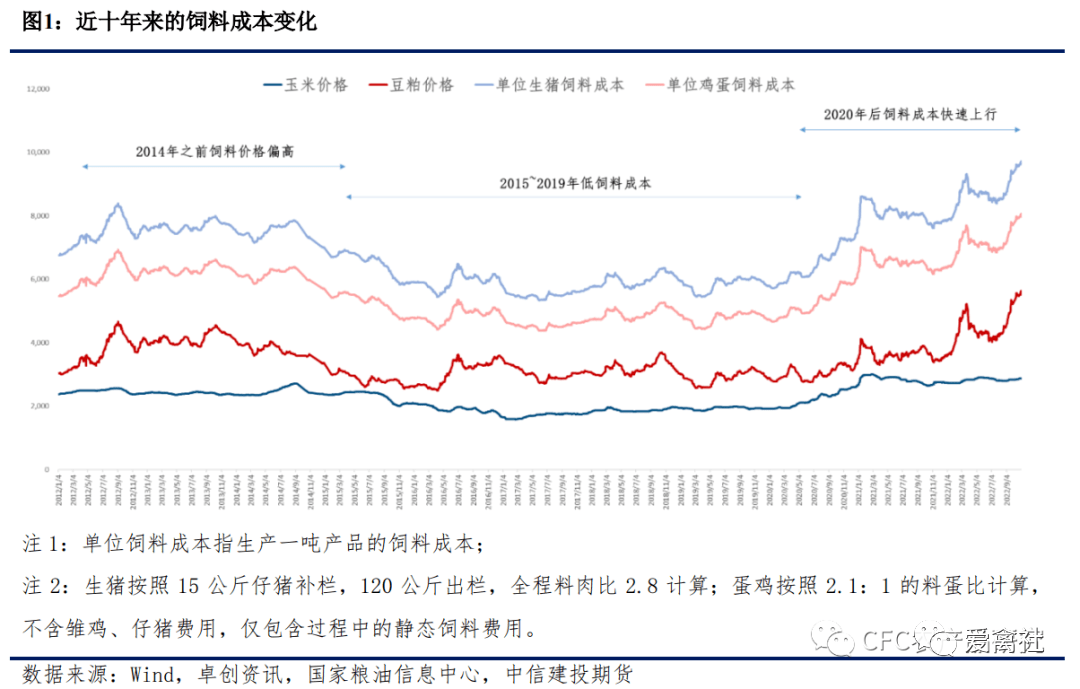 从下图我们大家可以看到,2012年至今,我们经历了饲料价格的回落、持续的低位以及2020年后饲料价格的快速上行。长期的饲料成本重心由占比较大的玉米决定,而短期饲料价格的波动受波动率较高的豆粕影响。在玉米价格持续高位,豆粕价格快速上行的局面下,目前饲料成本已经来到历史高点。