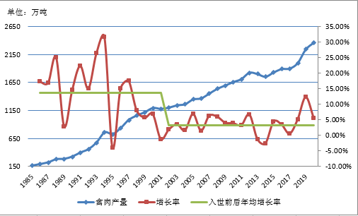 入世前年均增长13.7%,入世后3.3%(不含2019年增幅)。禽肉产量保持增势,消费易受突发事件影响(如速生鸡、速生鸭、活禽交易等)。