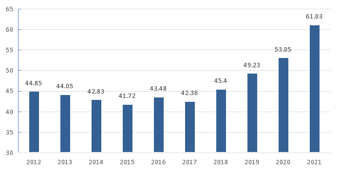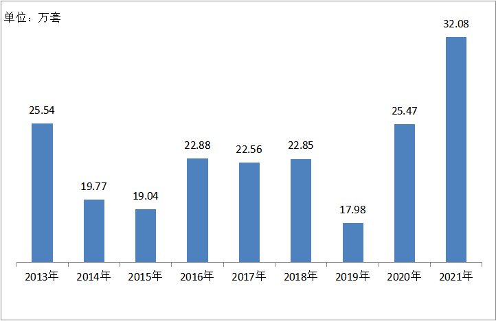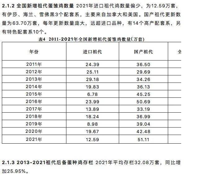 2.1.4 2008-2021年祖代在产蛋种鸡存栏2021年存栏61.23万套,同比上升4.95%。远高于实际需要的36万套,祖代向全国供种富富有余。