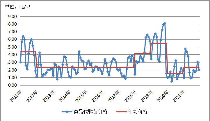 2.5.5 2012-2021年主产省鸭苗价格2021年鸭苗平均价格为2.33元/只(成本2.39元/只),鸭苗价格波动较大。鸭苗价格2021年下半年持续低迷,且鸭苗价格高报低卖的情况时有发生。养殖成本同比大幅度的增加的问题大多是饲料价格持续上涨和种鸭养殖周期缩短。