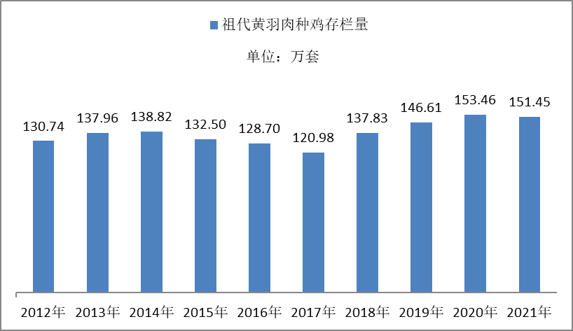 2.3.2 2012-2021年全国祖代在产黄羽肉种鸡存栏2021年,全国在产祖代黄羽肉种鸡平均存栏量151.45万套,同比减1.31%。仍处于历史高位。