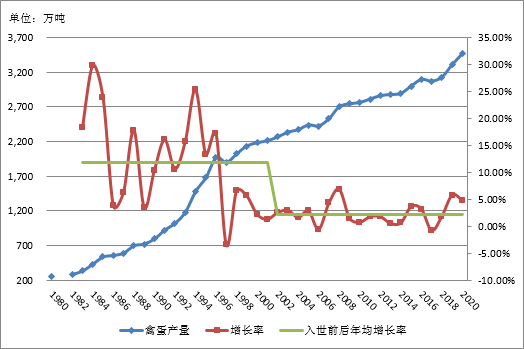 贸易对产业高质量发展产生深远影响,入世前年均增长11.8%,入世后2.2%(不含2019年增幅)。禽蛋产业进入平稳发展阶段,波动幅度收窄。