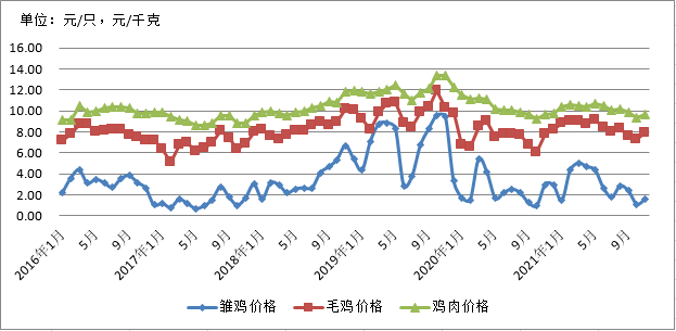 2.2.6 2016-2021年白羽肉雏鸡、毛鸡、鸡肉价格白羽肉雏鸡、毛鸡、鸡肉价格的同向变化显而易见。2021年,商品代雏鸡平均价格2.78元/只,毛鸡(市场鸡)平均价格8.36元/kg,鸡肉价格10.15元/kg,同比下降1.24%。2021年鸡肉产量增加,但是价格下降。