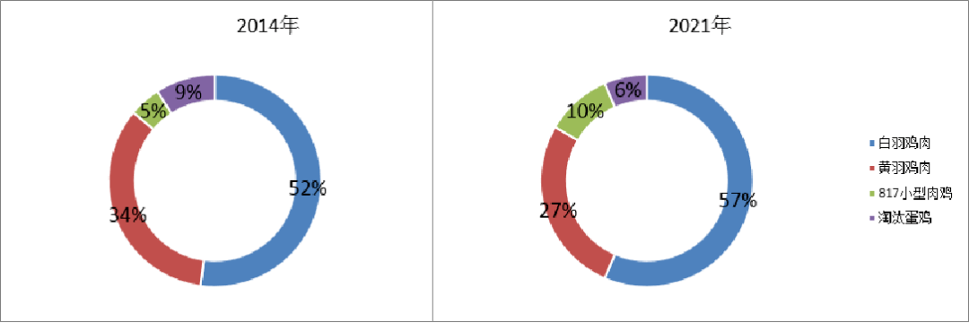 2021年白羽肉鸡种鸡存栏,肉鸡出栏“双增”;黄羽肉鸡种鸡存栏,肉鸡出栏“双降”。2021年白羽鸡肉占比57%,2021年黄羽鸡肉占比27%,近年来持续增加的是817小型肉鸡,呈现持续增量的态势。