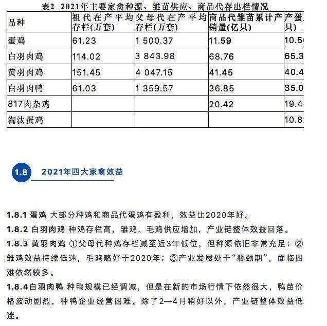 2.2.8 结论和预判种鸡存栏已经处于高位,高存栏将在2022年延续。可供应的雏鸡数量增加。产业面临产能过剩和市场风险。终端鸡肉价格总体低迷,产业链效益较2020年回落。