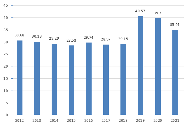 2.3.5 2018-2021年父母代雏鸡供应量2021年,监测企业父母代雏鸡供应量同比减少12.81%,说明父母代雏鸡转卖商品代比例增多。外销量占比(供应量包括外销量和自用量)30.3%(2020年29%、2019年31%、2018年35%),与2018年相比减幅明显。