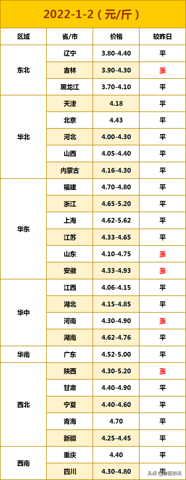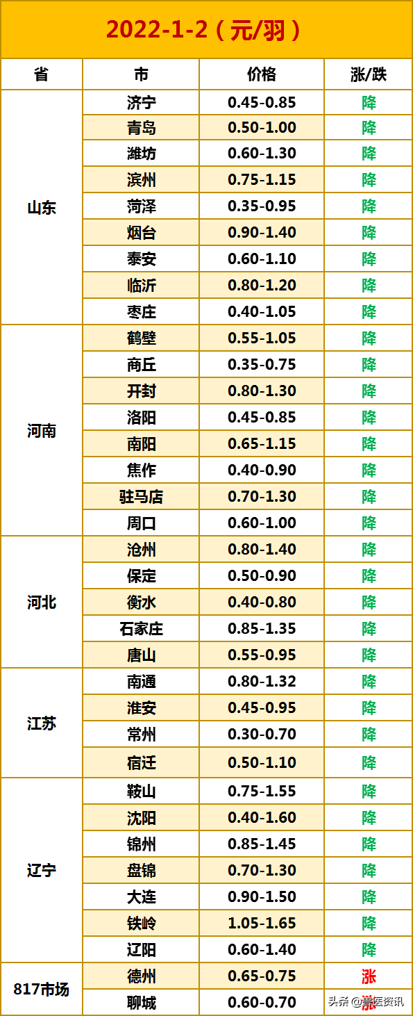 蛋价日评:鸡蛋价格大致走稳,部分地区有上涨。现在蛋鸡饲养量虽持续康复,但经产蛋鸡存栏环比持续下降,鸡蛋产值有限,跟着老鸡筛选量的增加,鸡蛋供应将进一步削减。年末我们翘首以盼的消费旺季并没有按期到来,高价蛋价出售不畅,各环节均有余货。元旦前后受消费需求适度增加,部分商场走货速度或稍有加速,估计近期蛋价持续小幅下降后或有适度回涨的概率,但春节前蛋价应该都不会有大面积上涨的空间。